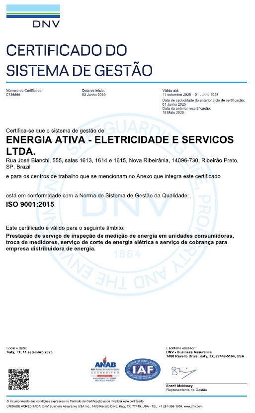 A Energia Ativa é uma empresa certificada que esta comprometida na melhoria dos serviços prestados, processos técnicos, com o aprimoramento constante de sua equipe, inovação e manutenção preventiva de seus equipamentos, respeitando todas as normas atuais vigentes.